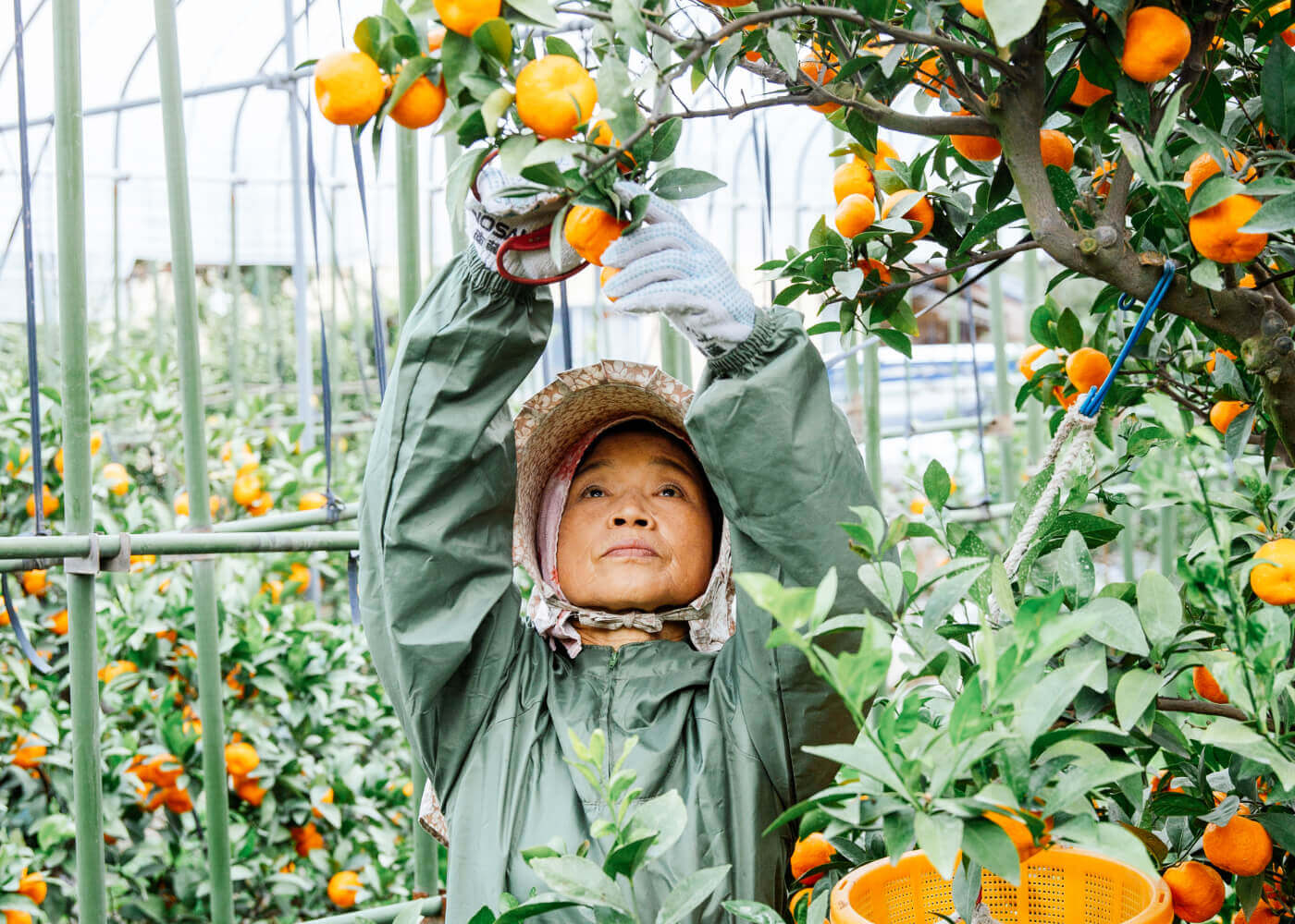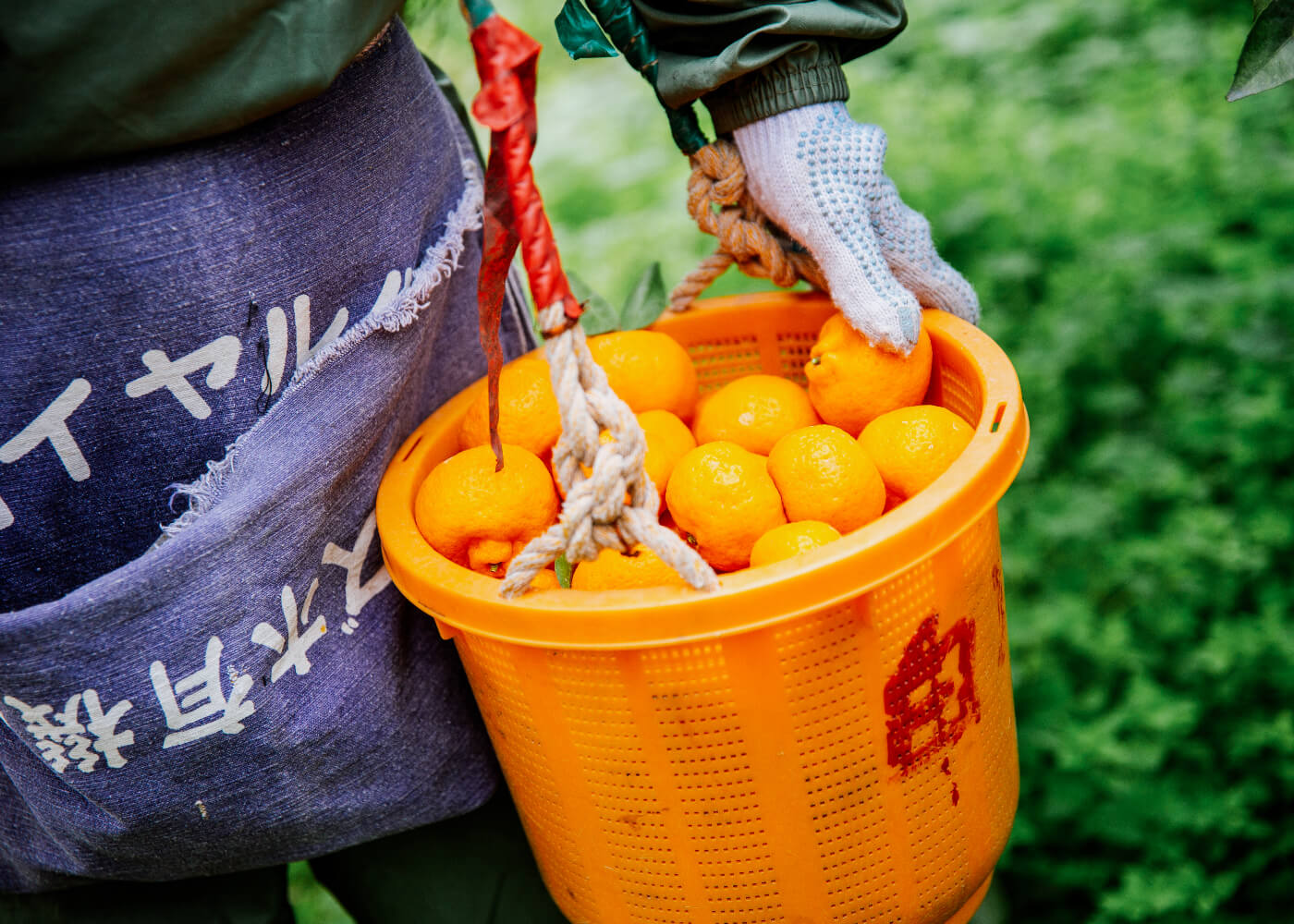 周囲を海に囲まれた火山島で育つ桜島小みかん。1年を通じて灰が降る環境での栽培は、決して楽なものではありません。灰を避け、ハウス栽培を行いますが、細かな灰は隙間からも入ります。果実に灰がつくと果皮がやけどをして傷物となるため、一つずつ丁寧にハケで払います。収穫は11月中旬くらいからのおよそひと月のみ。地元でも市場には年末のひと月ほどしか出回らない、希少な果実です。